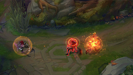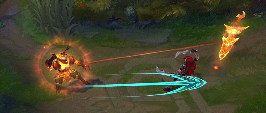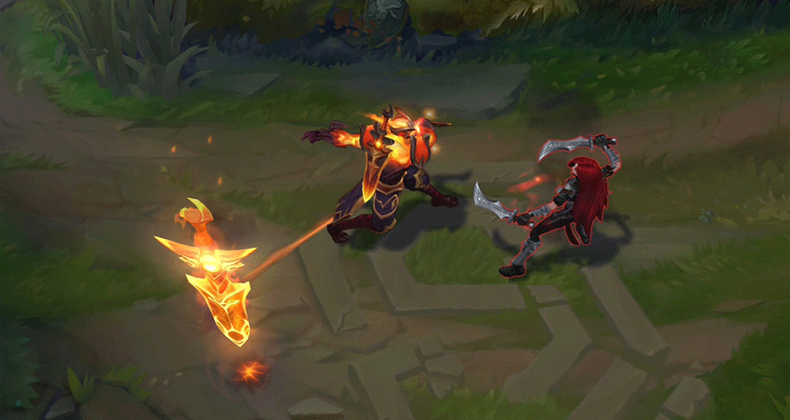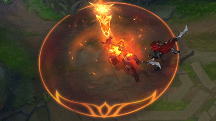 Q - 황혼 강습(Twilight Assault)은 기의 검을 불러내고, 기의 검을 불러들이는 방향 모든 적에게 피해를 주며, 이후 추가 평타 강화가 이루어지는 스킬이죠. 해당 신스킨에서는 기의 검이 불의 화신들이 들고 다닐법한 화염의 검으로 변경이 되었으며, 온통 붉은빛을 띱니다.